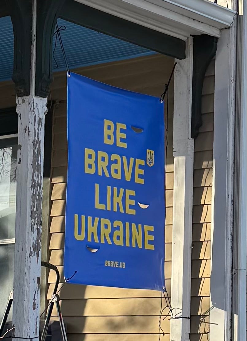 Not long after Russia invaded Ukraine, my wife Amy had a sign made that hangs outside our house. It’s blue with yellow capitalized sans serif letters and it says “Be Brave Like Ukraine.” She had it made to show support for the Ukrainians but the message isn’t for them. It’s for us.